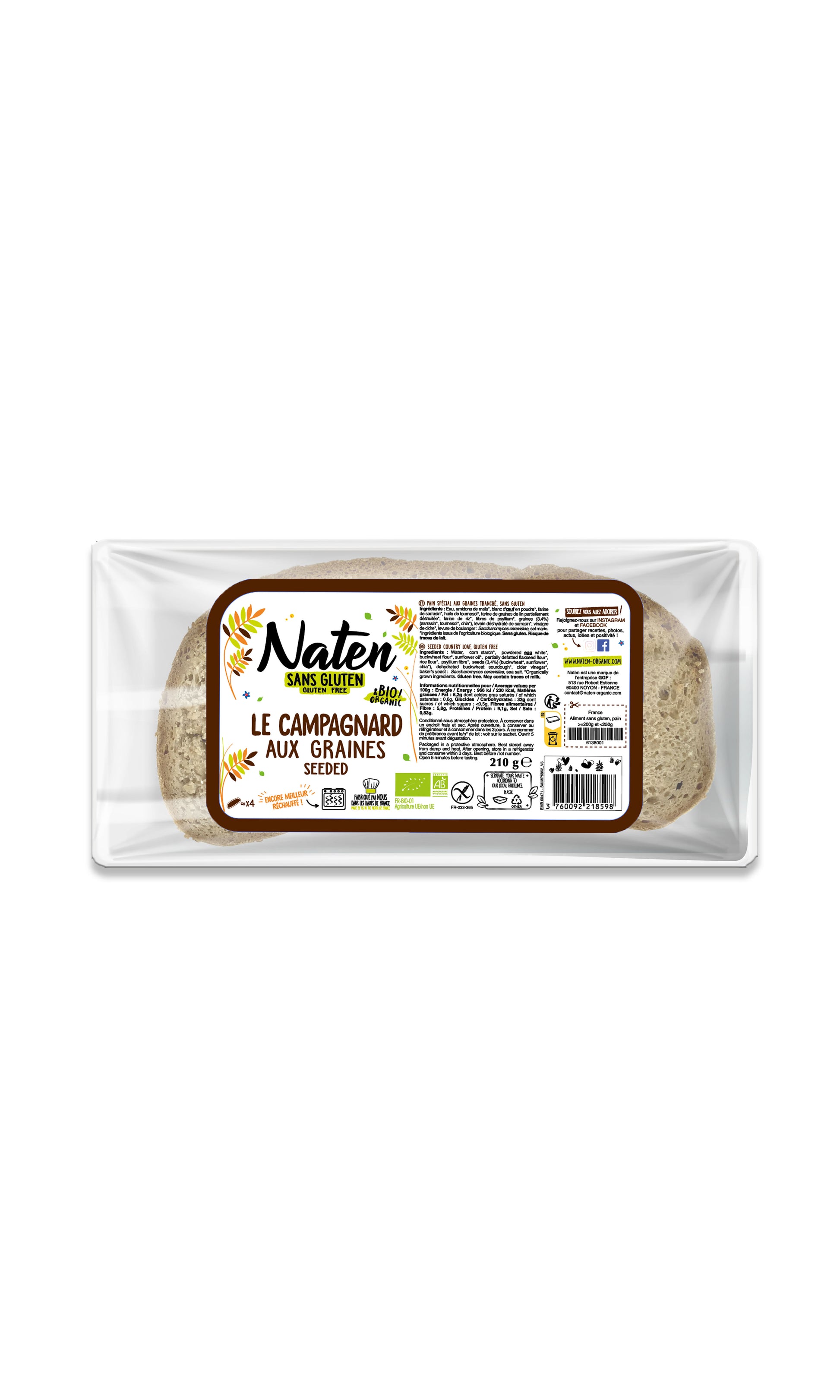 Ingrédients : Eau, amidons de maïs*, blanc d'œuf en poudre*, farine de sarrasin*, huile de tournesol*, farine de graines de lin partiellement déshuilée*, farine de riz*, fibres de psyllium*, graines (3,4%) (sarrasin*, tournesol*, chia*), levain déshydraté de sarrasin*, vinaigre de cidre*, levure de boulanger : Saccharomyces cerevisiae, sel marin.